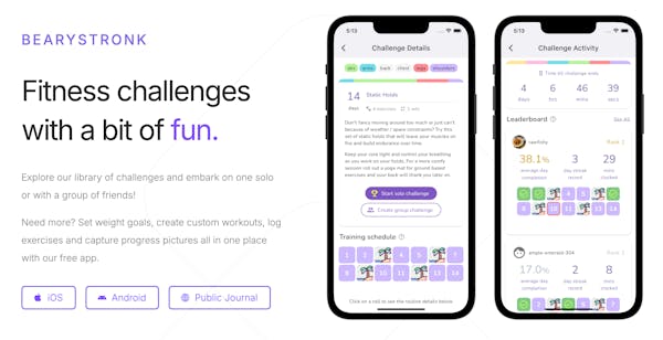 BearyStronk is a fitness app with simple, mostly at home routines for those who can't spend dedicated hours in the gym. Take on 1 - 4 week challenges with friends for some fun or go solo with pre-made and generated workouts that get you going immediately!
