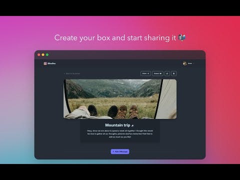 • Create and add a banner to your box • Share the link with everyone you like through Whatsapp, Telegram, Twitter, Messenger, X etc... • People can then post a message, pick their message color, and add a taken-on-the-spot photo to it • Messages can be read immediately or... • ...Keep the box sealed so all the messages will be blurred (and encrypted, no need to open your CSS Inspector here 😉) until you decide to open it and share it with your participants