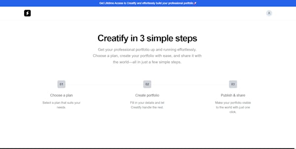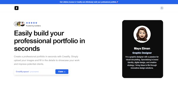 Please check it out and help spread the word! Your support would truly make a huge difference. 🥹@buildwithiqra Big shoutout for your launch! Wishing you endless success and new opportunities. What’s your vision for the future of this project?@kjosephabraham Thank you! For Creatify, the goal is to make it simple for anyone, like designers, architects, or bookkeepers, to quickly create a professional portfolio. We want to help people showcase their work easily and impress potential clients without needing tech skills.@buildwithiqra Awesome product! Have some further thoughts about the product that I'd love to share. What's the best way to contact you directly?@jonah_lecker1 on X @buidwithiqra or through email creatifyspace@gmail.comCongrats on the launch! Just curious, if you are providing LTDs, why not launch on Appsumo too?@lakshya_singh Thank you! I have never heard of that i will launch there aswellHey @buildwithiqra that design is really cool. This makes a lot of sense for one men business such as architects, bookkeepers and others who do not need fully fledged websites.