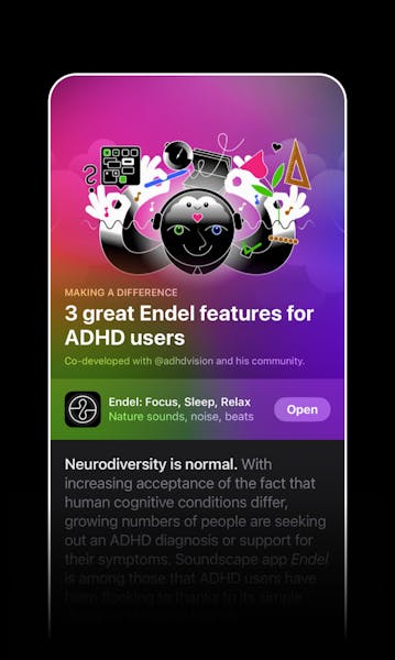 Helping against distractions is Endelās area of expertise. However, filtering out distractions multiplied by unique ADHD traits of a neurodivergent person is a whole different kind. Luckily, Nik @adhdvision, an ADHD advocate and Endelās long-standing collaborator, helped us form a set of features to match ā some of them going beyond just sound. Nikās engaged community willingly participated in the research, testing, and even marketing for this new face of Endel. The resulting major update was co-created with hundreds of ADHD people who entrusted their focus, relaxation, and sleep to Endel even before the app could offer a proper ADHD-focused experience. But now, they have their own domain inside the app!