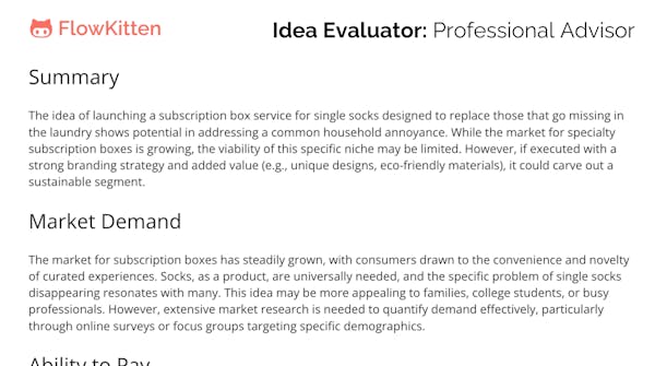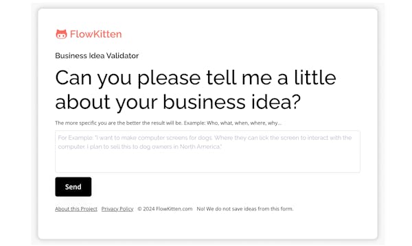 Validate your business idea instantly with FlowKitten, the AI-powered, 100% FREE idea validator. Get instant feedback and shape ideas that people love in just 20 seconds.Haven't tried FlowKitten yet. But from what I see in the demo, I can see it's a practical tool. Thank you for creating something this useful.@salar__davari Thank you so much, Salar! It will be here, free anytime you want to use it. I really appreciate your support and kind words.@salar__davari Cheers to the team behind this! Wishing you all the best on this new adventure. What are you most excited about with this launch?@kjosephabraham Thanks so much, Joseph! What I’m most excited about is seeing how people use it to refine their ideas and make better decisions early on. It’s been great to build something that will be genuinely useful to other entrepreneurs. Looking forward to seeing where it goes!Super nice idea and i love that you can get insights before getting knees deep! Well done and congratulations on the launch!@ramywafaa Thank you so much! I’m really glad you appreciate the early insights FlowKitten provides. That was exactly the goal—helping people get valuable feedback before diving in too deep. Appreciate the kind words and support! Good luck on your Vectopus launch! Following. :)Hey Hunters 👋