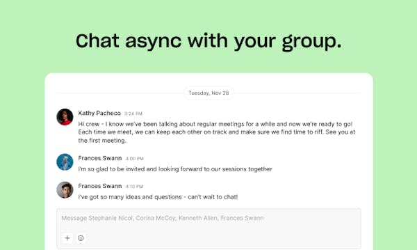 š„ Gather your favorite peers for a monthly check-in to unlock, inspire, and vent š” Set up biweekly customer feedback sessions for your new product š Create a digital book club without juggling calendars and video platforms š©āš Gather with fellow students from a course you took, to keep up your learning šÆ Assemble a few folks working on a shared goal, to stay accountable with quarterly checkins