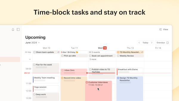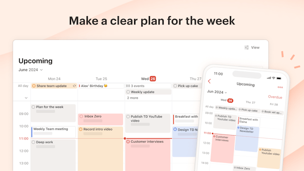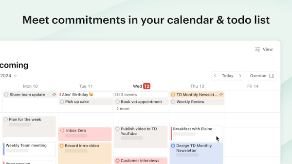 Todoist's new built-in weekly calendar lets you manage your tasks and your time in one place. Time block tasks alongside events synced from your Google Calendar to create a plan you can stick to.