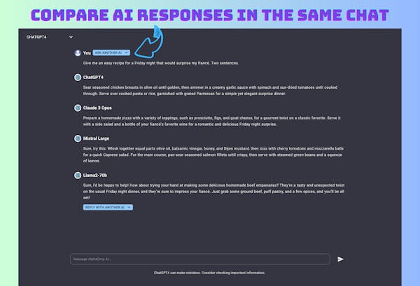 AlphaCorp AI is a multi-model chat app where you can group chat with AIs, such as ChatGPT, Claude, Mistral, and more, all under a single subscription. Compare their responses or run AI-to-AI chat simulations within a single chat.
