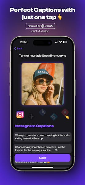 Generate catchy captions for your photos with one tap. Save time posting daily to grow your audience. Focus on making good photos, we'll add the perfect captions.