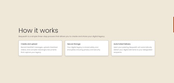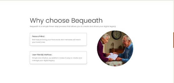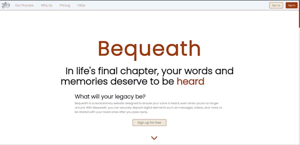 Bequeath is a revolutionary website designed to ensure your voice is heard, even when you're no longer around. With Bequeath, you can securely deposit digital elements such as messages, videos, and more, to be shared with your loved ones after you pass away.