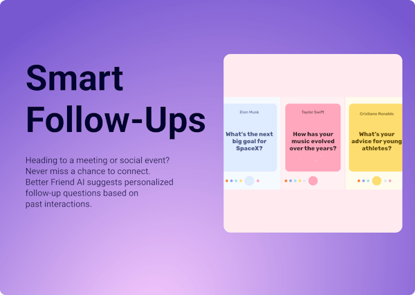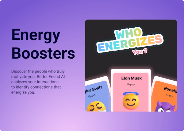 Keep your conversations memorable with Better Friend AI. Record a quick voice memo, and let our AI summarize the key points, suggest follow-up questions, and track who energizes you. Your personal CRM for better, more meaningful relationships.
