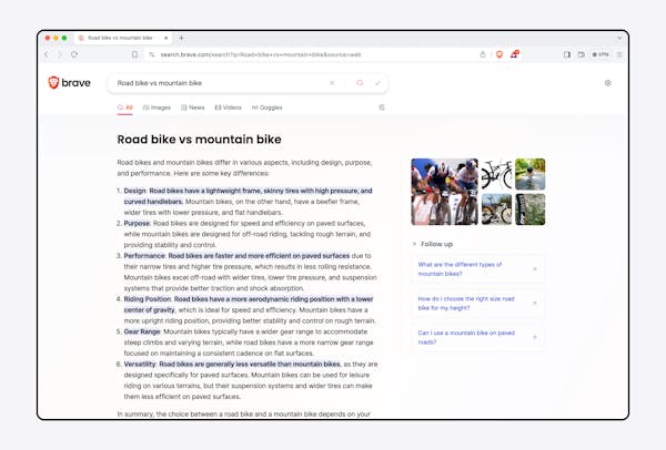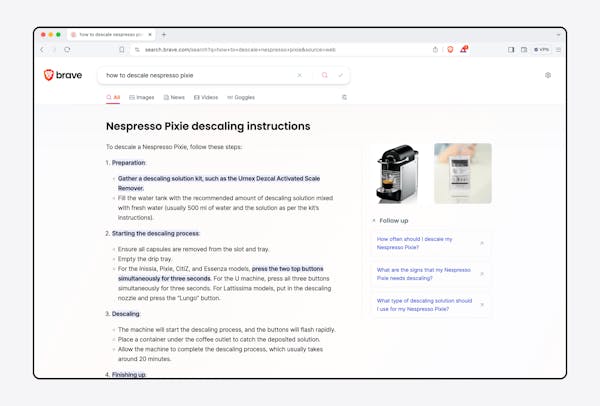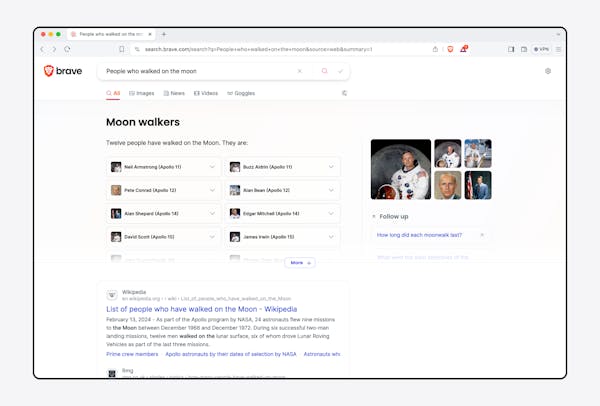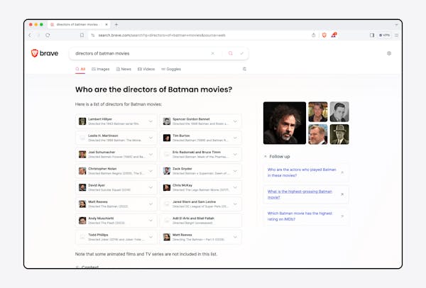 With Brave Search, you get real answers, faster. AI-powered answers to almost any question, in addition to a list of links. Brave delivers results from its own, built-from-scratch index. No secret methods or algorithms.