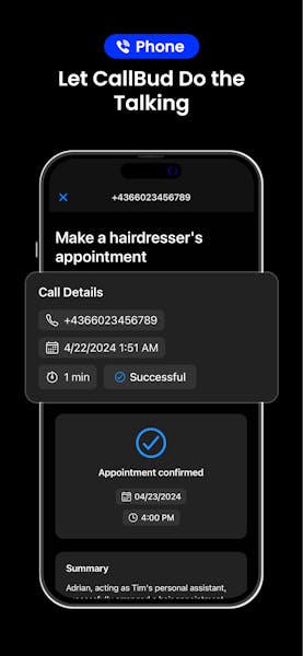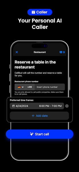 The revolutionary app is designed to handle your appointment calls. No more fear of calling or time wasted on making phone calls for restaurant reservations, hairdresser appointments, or doctor visits. CallBud AI will make the calls for you.