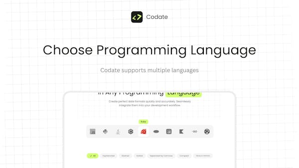 Codate helps you quickly create date formats for any programming language. Just pick your language, choose a date format, and get the code you need. Save time and make coding easier with Codate. Join the beta and start simplifying your dates today!