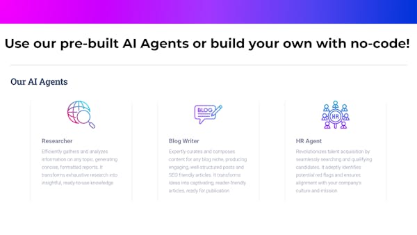 Create and train your AI Team to automate routine tasks in Sales, Marketing, HR and beyond without coding. Utilize advanced LLMs like GPT-4 and Claude to Simplify your workflows, increase productivity, and keep your team focused on what matters.