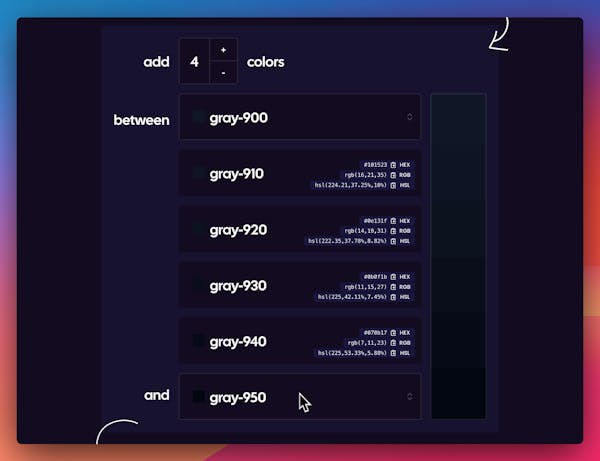 Ever felt like the 11 color shades in Tailwind were not enough? Wished there was a gray-975 or a blue-550? Have a look at the free tool!