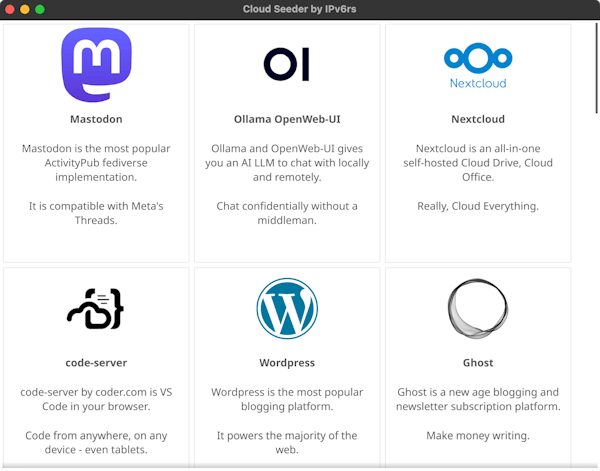 IPv6rs is an IP provider. We provide Cloud Seeder, an open source software suite, that allows you to manage server appliances easily. Self hosting should be for everyone, because the only thing between your host and your data is trust. Trust is not security.
