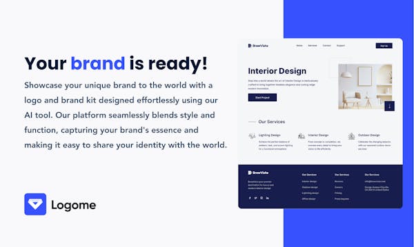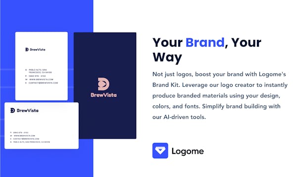 Design your logo effortlessly with Logome's AI! Choose customizations, supercharge your brand with our Brand Kit. Produce brand materials instantly, simplify brand building. Capture your essence, share your identity with the world, and be remembered!