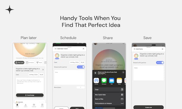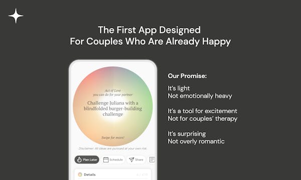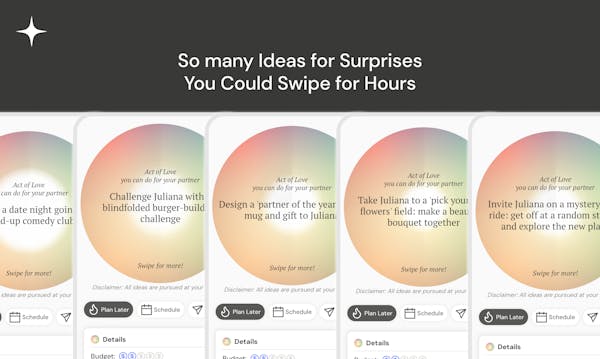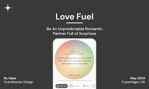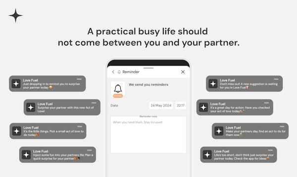 Love Fuel makes you an unpredictable romantic partner full of surprises. The app provides over 450 surprise ideas and serves as your tool to plan them. It reminds you of what truly matters, even when the practical aspects of life are distracting.