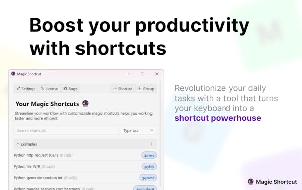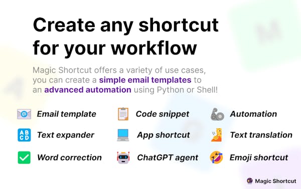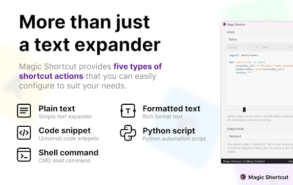 Magic Shortcut allows you to create programmable shortcuts that works on any apps for your repetitive tasks, boosting your productivity. Whether it's a simple text expander or a robust automation using Python, all easily done by using Magic Shortcut!