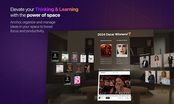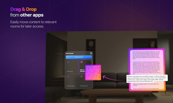 Mind Studio elevates thinking with the power space. Effortlessly offload, organize, and anchor thoughts in your environment. Drag-and-drop relevant content from other apps for fresh inspiration. Create multiple rooms in one environment for increased focus.