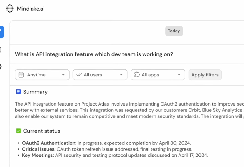 Mindlake is an LLM-powered search engine that gathers discussions about your projects spread across tools you use at the workplace such as Slack, Gmail, Jira and Google Drive. It gives you a birds-eye view of the ongoing status of your tasks, highlights critical excerpts from conversations and issues which need your attention (such as projects getting delayed, and things you missed following up on)