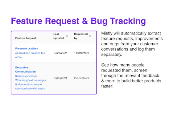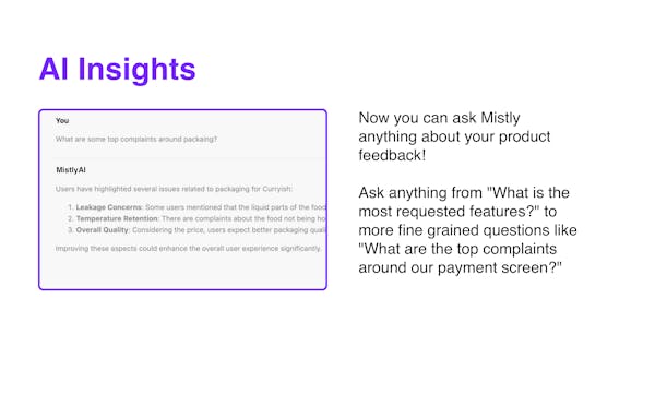 Use our AI Insights to analyze feedback, track features and bugs, and Slack recaps to stay on top of your product's needs.