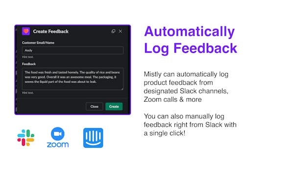 Mistly automatically logs product feedback from designated Slack channels, Zoom calls, and more, ensuring no insight is missed.