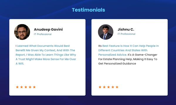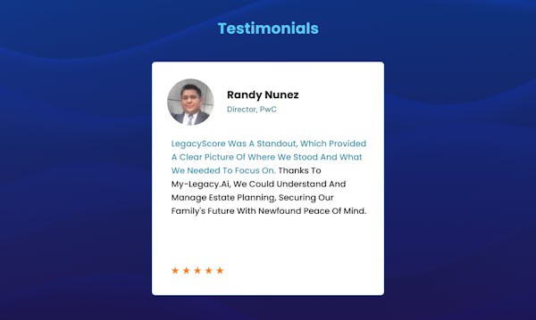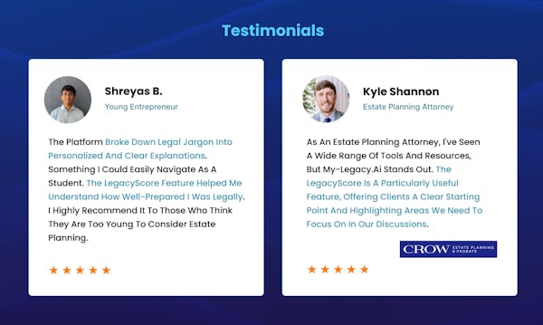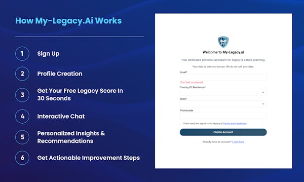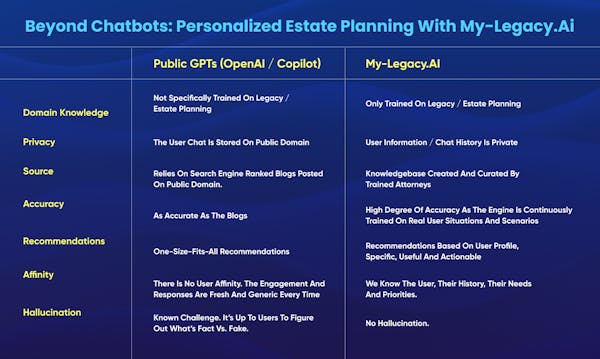 My-Legacy.ai stands out as a specialized platform built for estate planning related services. Get instant answers, personalized recommendations, actionable workflow and estate attorney references through our AI-powered platform backed by 12-pending patents.