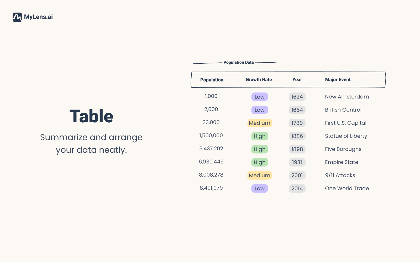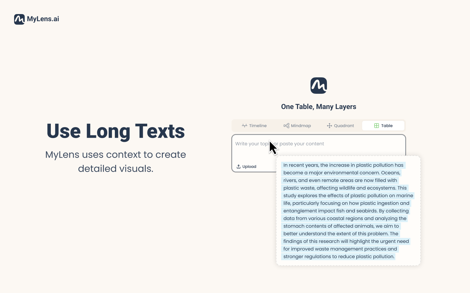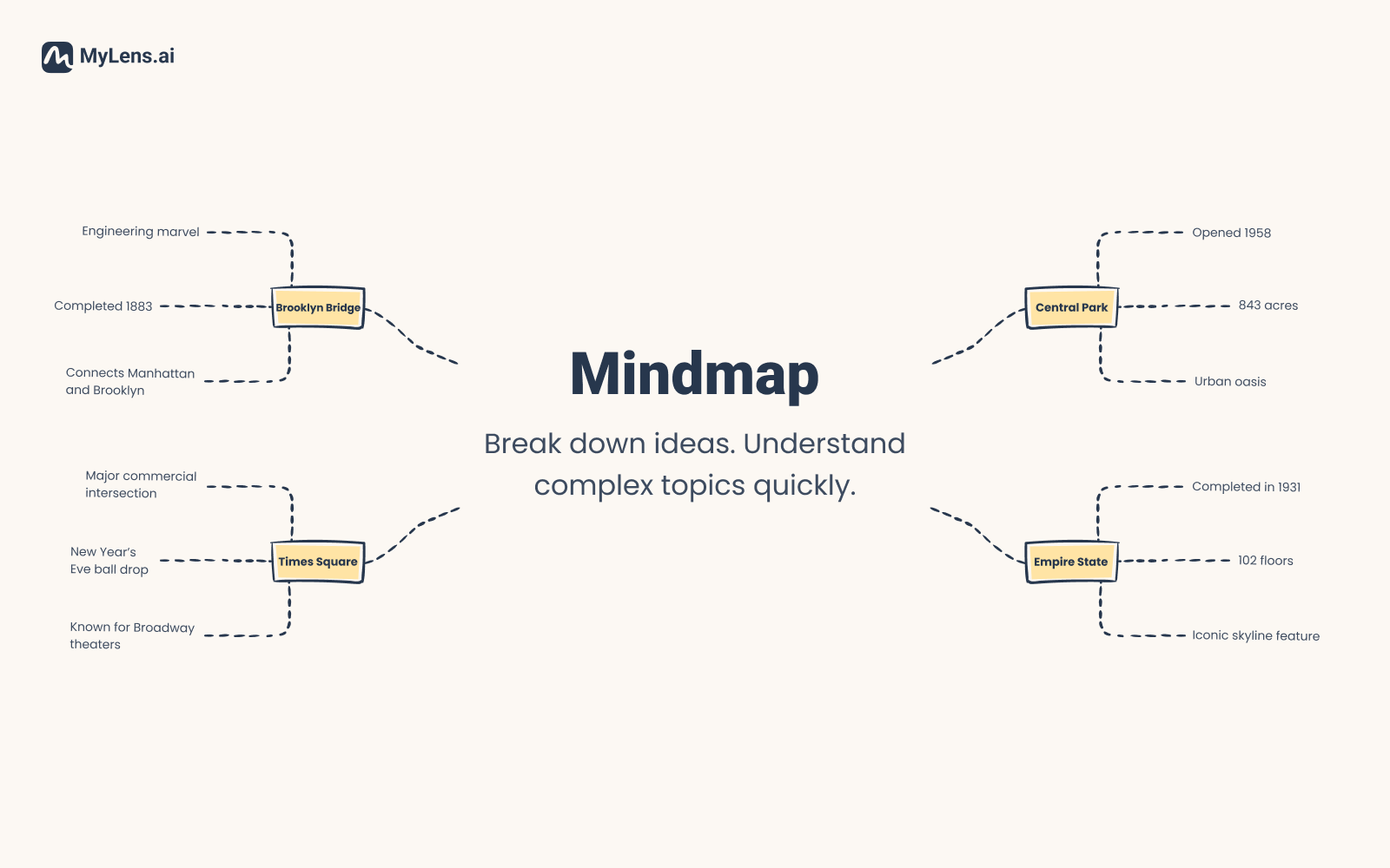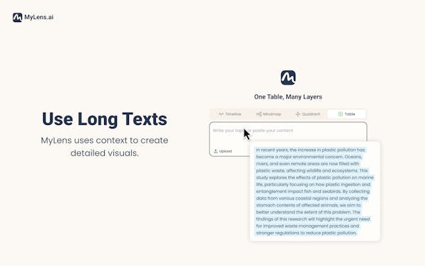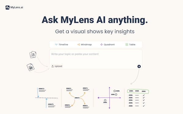 MyLens AI simplifies learning about anything with simple, clear visuals. Whether you ask a question or upload complex data, it creates easy-to-understand visuals that highlight key insights and provide deep understanding—all with one click.