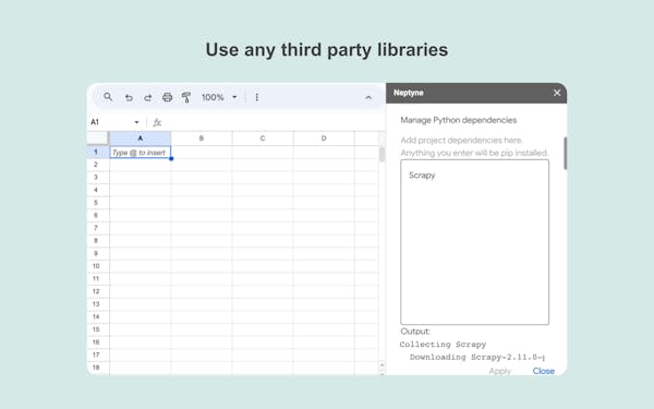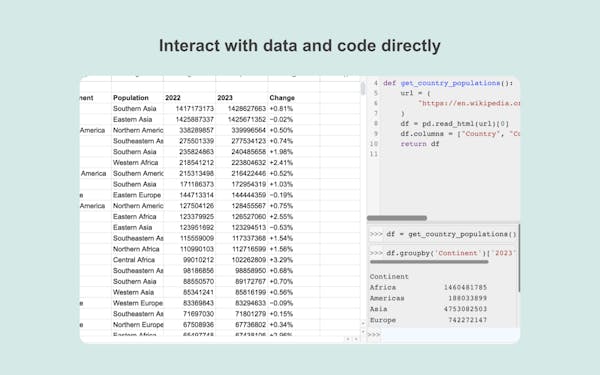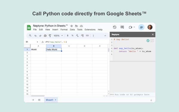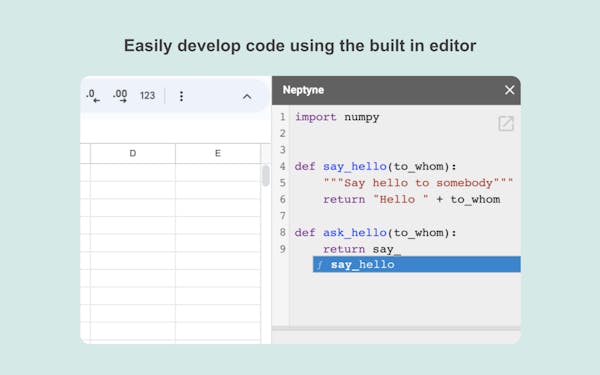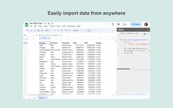 Neptyne lets you extend the functionality of spreadsheets by writing your own Python functions in an integrated editor and REPL. Import data from the web, implement your own custom formulas, and leverage the power of the vast ecosystem of Python packages.