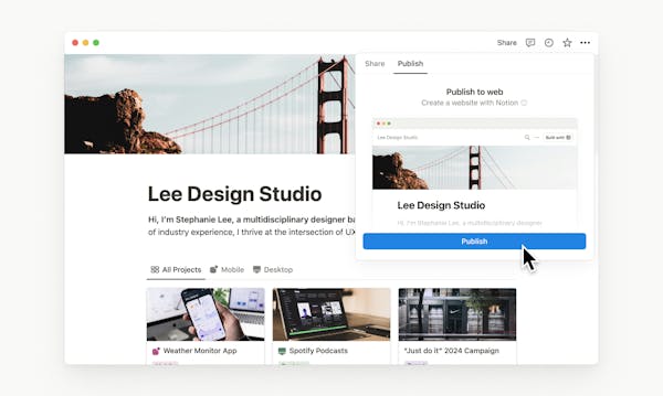 Get a beautiful site up in minutes using Notion’s powerful building blocks and flexible web editor, combined with a set of new tools to help you manage and customize your site: custom domains, navigation bars, color themes, analytics, SEO, and more.