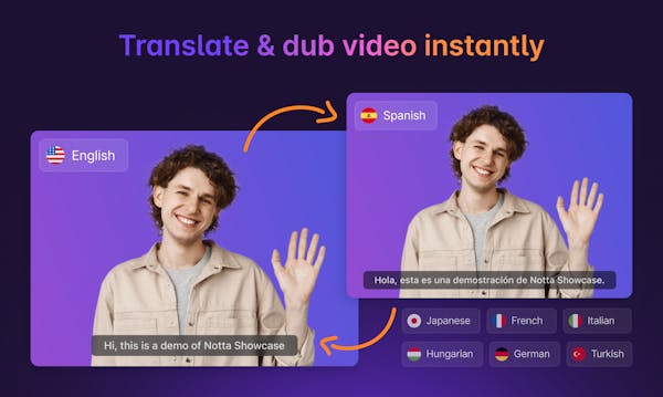 Notta Showcase is an AI video translator that enables creators and businesses to translate videos into 15+ languages effortlessly. With natural-sounding dubbing, your video will be ready to resonate with a global audience. Easy, fast, and affordable!