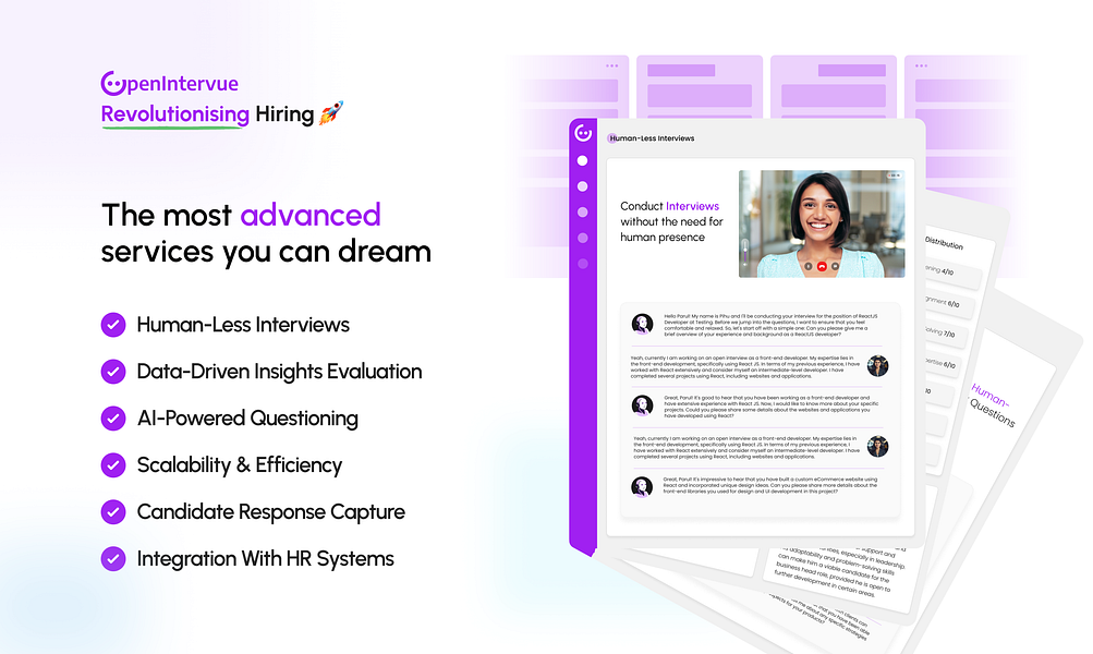 OpenIntervue is revolutionizing the hiring process with cutting-edge AI technology. Our platform conducts fully automated, efficient, and bias-free interviews, eliminating the need for human involvement. From interview question generation to candidate evaluation, OpenIntervue streamlines the entire process, providing data-driven insights for informed hiring decisions. Join us in redefining the future of recruitment with seamless, technology-driven interviews that enhance efficiency, reduce bias, and deliver a superior candidate experience.