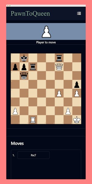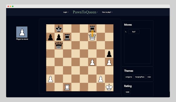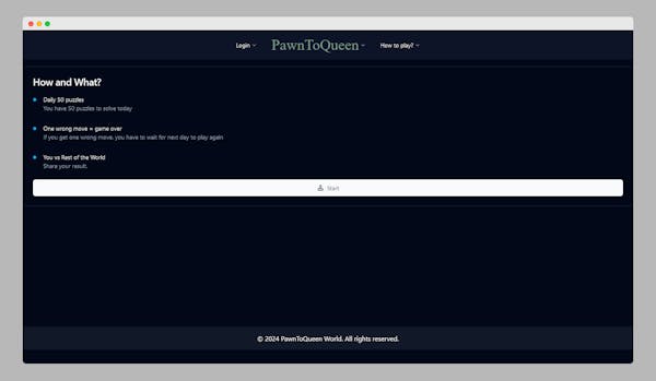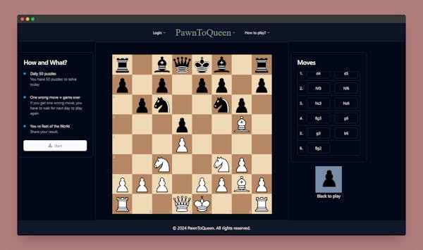 Introducing PawnToQueen! Solve 50 fresh daily chess puzzles, but beware-one wrong move ends your game for the day. Challenge yourself and climb the global leaderboards! Sign up features coming soon: access historical puzzles, view solutions, and save progress.