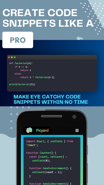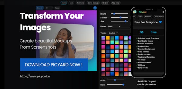 Picyard is a free online tool that allows you to create beautiful images for social media, blog posts, presentations, and more. You can use Picyard to create Beautiful Images, Testimonials, Code Snippets, QR Codes and then download them as PNG or JPEG files.