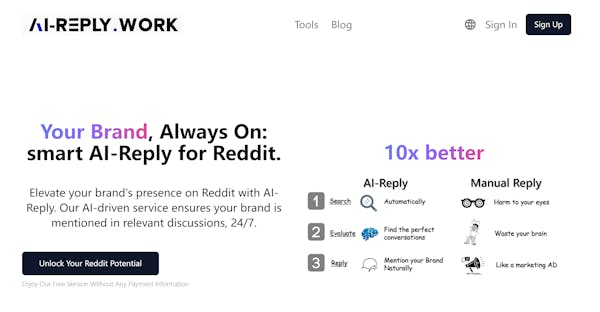 Elevate your brand's presence on Reddit with AI-Reply. Our AI-driven service ensures your brand is mentioned in relevant discussions, 24/7.Hello Product Hunt community!