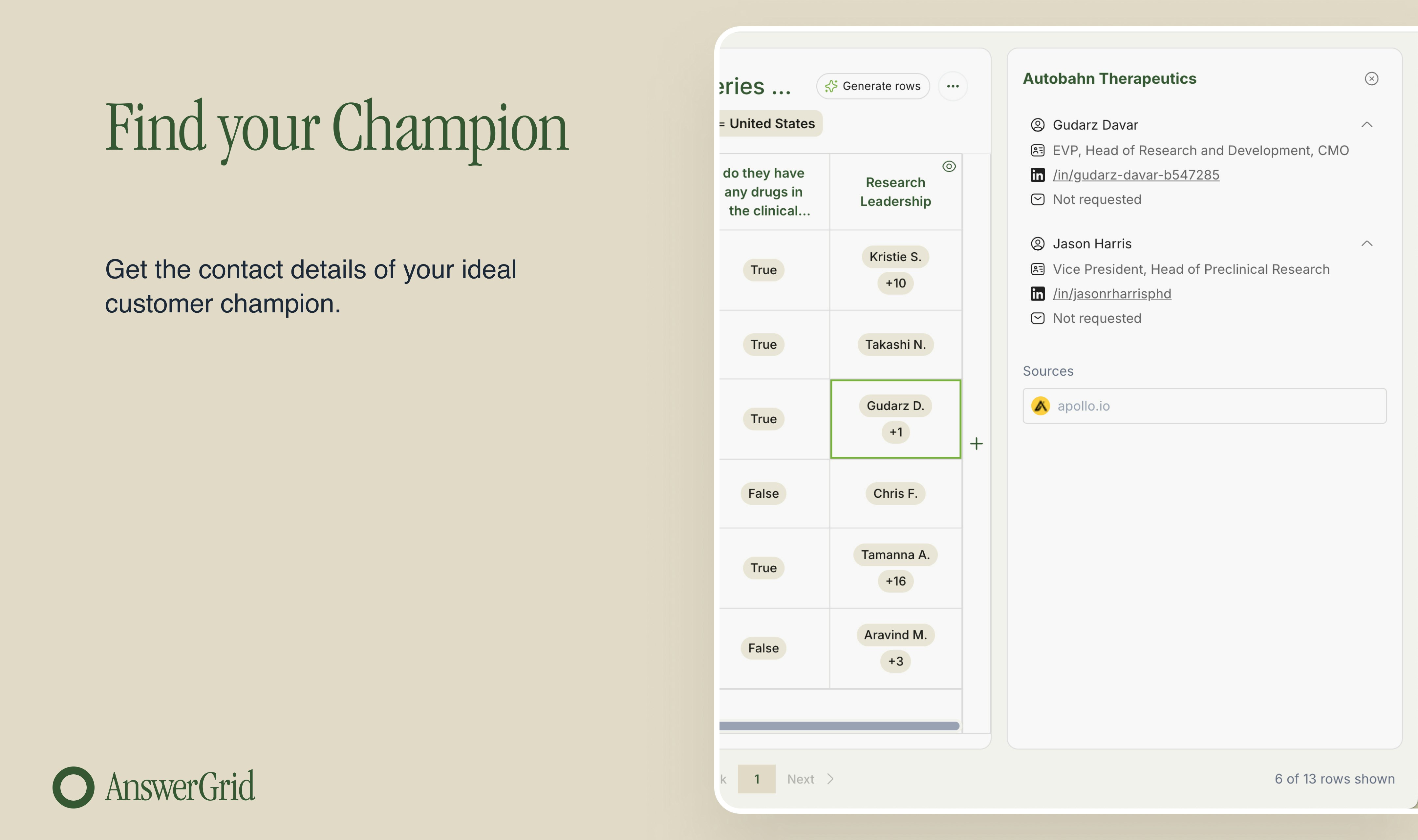 We’re excited to introduce AnswerGrid, an AI-powered prospecting research tool. We want to help you discover the 30 [*] most relevant leads worth the investment of manual outbound every day by deploying AI agents to qualify prospects based on your precise criteria.
