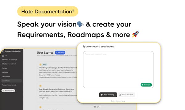 I've written PRD for 4 years, and I know the pain. But why using the voice I wonder?@danielwchen Thank you. We actually support text input, voice input as well as uploading a document for seeding the AI content. Just highlighting voice here on Producthunt because we thought it is catchy for the launch :) Also another reason to highlight is some of our early users have found voice based input very effective to just speak out their product ideas in a very casual way and craft a document in few seconds from it.I had a discussion with a friend of mine about a similar journaling tool that launched here recently. Super happy to see the implementation for product management, specific and valuable input. Especially from early founder teams šŖ