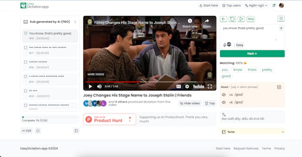 I know my product is far from perfect, so I truly value feedbacks!Like the edu aspect. I have a plugin called BeRead that has similar options – do you consider creating one?This sounds really interesting, especially the ability to add any YouTube video! How does the feedback on speaking work? Is it real-time or after you finish a sentence? Also, what's the roadmap for future features? Excited to see how EasyDictation can help improve my learning experience!Hi @ema_elisi , thank for the interesting question. The app feedback on the word-level pronounciation, the app adopted a AI Speech to Text, so if you talk, the app will feedback on what it heard like as same as the native specker feedback: what word is correct, what word is wrong, etc.Hello @hanzotruong for some reason, I cannot access the site. Maybe it's from my end but could you look at that?@frankie_amoah oh nooooo,