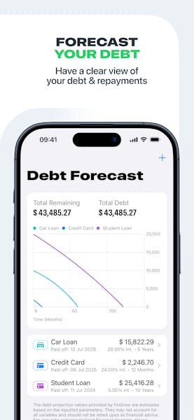 Forecast & Manage Debts Keep an eye on your debts with FinGrow’s debt forecast feature. Create and edit debt entries, track your repayments, and get a clear view of your financial future. Managing debt has never been easier.