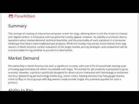 Validate your business idea instantly with FlowKitten, the AI-powered, 100% FREE idea validator. Get instant feedback and shape ideas that people love in just 20 seconds.Haven't tried FlowKitten yet. But from what I see in the demo, I can see it's a practical tool. Thank you for creating something this useful.@salar__davari Thank you so much, Salar! It will be here, free anytime you want to use it. I really appreciate your support and kind words.@salar__davari Cheers to the team behind this! Wishing you all the best on this new adventure. What are you most excited about with this launch?@kjosephabraham Thanks so much, Joseph! What I’m most excited about is seeing how people use it to refine their ideas and make better decisions early on. It’s been great to build something that will be genuinely useful to other entrepreneurs. Looking forward to seeing where it goes!Super nice idea and i love that you can get insights before getting knees deep! Well done and congratulations on the launch!@ramywafaa Thank you so much! I’m really glad you appreciate the early insights FlowKitten provides. That was exactly the goal—helping people get valuable feedback before diving in too deep. Appreciate the kind words and support! Good luck on your Vectopus launch! Following. :)Hey Hunters 👋