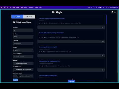 Git Begin: A web app to find & track your first open-source contributions. Filter GitHub's "good first issues" by language, stars and categories like Web Dev, ML, DevOps. Bookmark interesting issues. Dark mode included. Start your open-source journey todayI've just launched Git Begin, a web app that helps developers find their first open-source issues to work on. What Git Begin does: