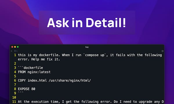 I use Hey in Warp. It's perfect. You can stay posted and get updates about Hey by following me on Twitter: https://twitter.com/lnxpylnxpy@elke_qin hey, this CLI tool sounds super cool and just what I've been looking for! Quick question though, do users need to have experience with command line stuff? I'm still pretty new to this, and I don't wanna get stuck if it's too advanced. Thanks for making it open source and free!Hey @robertthomas2, thanks for the compliments. There are a few commands that you need to run to make it work. It's not complicated for a regular user, but it's meant to be a quick in-terminal LLM assistant for those who use CLIs the most like devs.Wow this is so cool!! π₯ congrats Sadra on the launch!! π How are you able to make this free? ππ» π€― and what other advantages does Hey! have over asking the same questions to ChatGPT or Claude? ππ»This is neat.