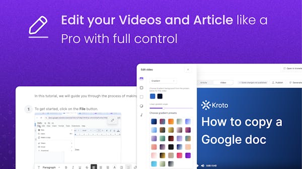 Kroto helps create stunning product documentation quickly. Our AI transforms screen recordings into detailed articles with beautiful GIFs and product videos with zoom-in effects, thumbnails, and custom branding, complete with natural-sounding AI voiceovers.TL;DR; Kroto helps teams create impressive product documentation fast. Our platform turns simple screen recordings into detailed articles and awesome product videos.