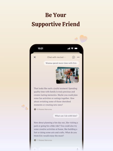 - Be Your Supportive Friend: Stay and chat with you, offering the kind of support and understanding that only a close friend can provide.@monkim I love Me.bot been using it for weeks, I use it to upload pics add context and, remember it later. So much helpful tools!!!Looks nice congrats! 🚀 The design looks great, and the features are super useful.