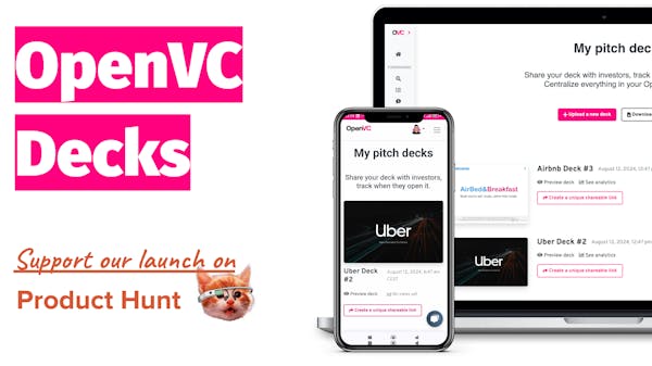 Steph & Lucas@stephnass congrats on the launch! What stack did you build this with?@rgndws Haha that's a question for @lucasroquilly@stephnass @rgndws hey Philipp, same stack as usual: rawdogging PHP, JS, HTML, CSS with jQuery and Bootstrap (no framework) 😁Steph and Lucas, good job. Appreciate you incorporated some perks, map but predominantly educational materials for newbies :) Wish you GL with the launch. These aspects I like the most.@busmark_w_nika Thanks Nika, and really glad you appreciate the educational materials. Many founders just want to "rush" to VCs and fail at raising. With a bit more insights, they could increase their chances by a lot. That's why we put a lot of emphasis on the knowledge, and not just the tools. It's an uphill battle, but thanks for highlighting it! :D@stephnass Noticed it first because I put emphasis on education first (one of my priorities in life) :D so I was like: WOOOOW! :D keep going! :)Looks cool. I used Brieflink for quite sometime, but ultimately had to revert back to docsend and drive as the mentioned one gets too slow often. Hope the experience would be smooth with OpenVC Decks.@ashrahman Please feel free to test by yourself and tell us what you think about the experience 🤩Great product! I've used docsend in the past and it sucked. I remembered how it messed up my deck's formatting and of course, it's not free.