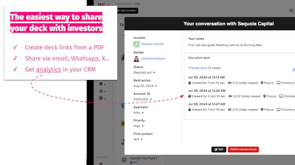 The best part: all the data is automagically pulled into your OpenVC CRM. No more back-and-forth between your deck analytics and your pipeline!