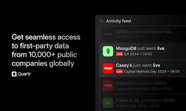 🖥️ Quartr Pro: This research platform for business desktop use assists finance professionals to increase productivity and uncover qualitative insights about public companies worldwide. Whether you're seeking detailed summaries or specific data points in slide decks, transcripts, or filings, Quartr Pro enables you to find it in seconds with the help of generative AI.