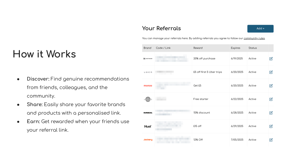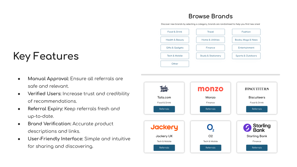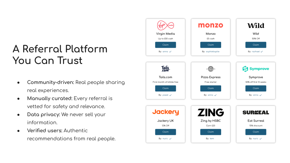 - Real People, Real Brands: We approve each referral and brand, checking it’s safe, relevant and valuable.