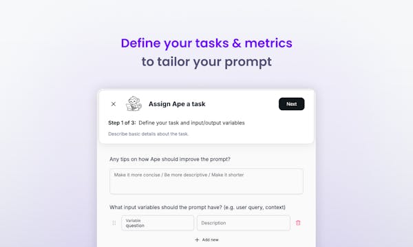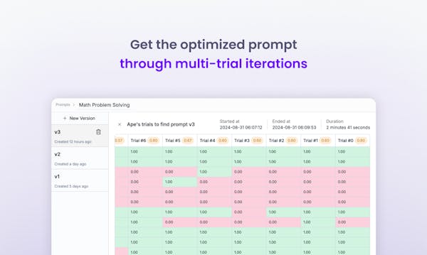 - From your base prompt and provided dataset, Ape (our AI prompt engineer) will iterate on diverse prompts, and find the mixture of instructions and few shot examples with the highest scores.
