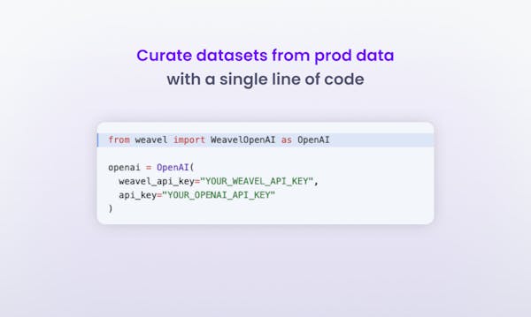 - Add one line of code to log LLM calls in your product. We automatically curate datasets from the logs - user representative dataset and out-of-distribution dataset for edge cases.