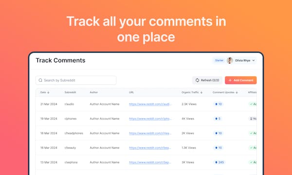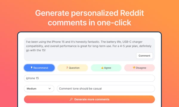Boost your Reddit engagement with AI-powered and personalized comments. Generate relevant replies, drive traffic and leads, and track performance with ease. Best for affiliate marketing, eCom products, and SaaS tools.