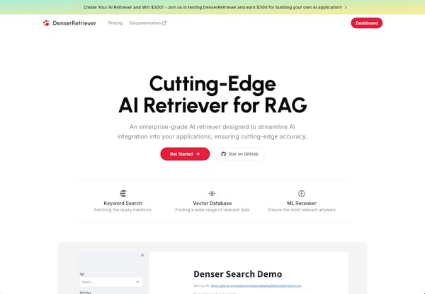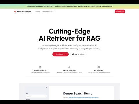 #AI #RAG #DenserRetriever #TechInnovation #CustomGPTs #GPTThis sounds like an amazing opportunity, especially for those of us in the AI space! Denser Retriever seems poised to bring some real innovation to the integration game. I love the idea of combining seamless deployment with accuracyāhaving a fully managed system is a game-changer. Looking forward to getting my hands on it and providing feedback. Big kudos to @zhiheng_huang for leading this initiative! Canāt wait to see the potential of RAG technology firsthand!@williamrobertscott Thanks for your comments! William. Feel free to give it a try :)Itās great to see a tool that makes it so easy to porotype and test AI applications. The open -source nature is a big plus!@diane_j_mcgee Thanks! Diane. Yes. We hope that the open source can benefit AI developers, especially those are interested in Retrieval Augmented Generated (RAG).This is such a well thought out product, from keyword search to ML Reranker and the ability to scale. I'm sure businesses needing reliable AI solutions will find this super valuable.@grover_reeves Thanks! Grover. The goal of our project is to bring the SOTA RAG accuracy with the combination of Keyword search, Vector DB, and Reranker. In the future, users can even choose different combinations to fit their specific use cases.